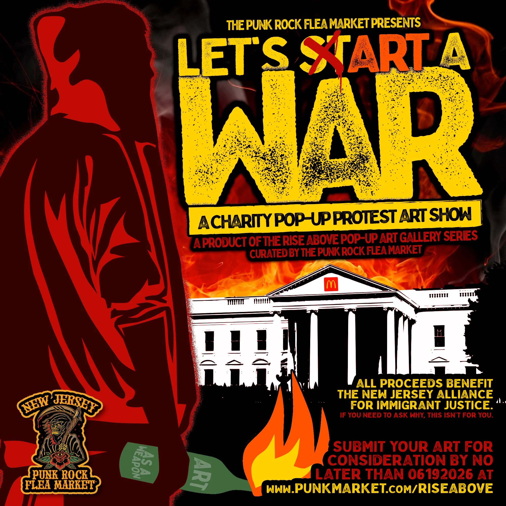LET’S stART A WAR is not about polite disagreement. It is a protest art exhibition for artists with something urgent to say and no interest in whispering it. This show is a call for work that resists cruelty, confronts power, rejects silence and refuses to prettify oppression for the comfort of those who benefit from it. We are looking for art that speaks loudly, challenges comfort, pushes back and carries real weight behind it.